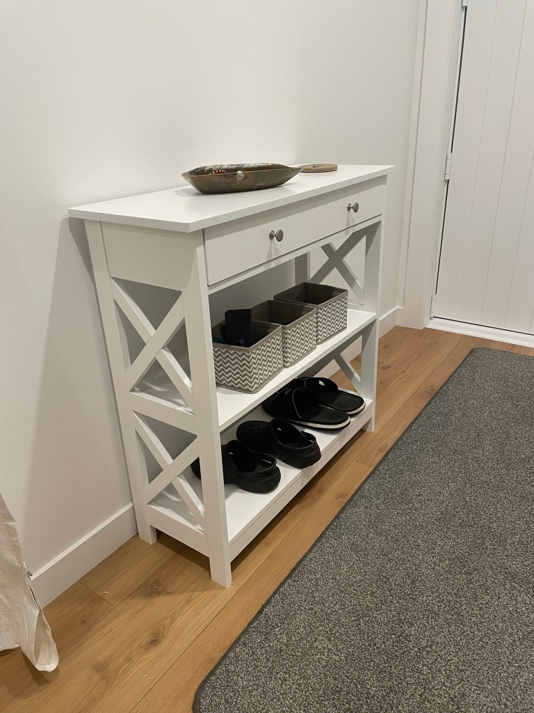 Lee and I make an excellent flat pack furniture assembly team. Today we put together our new hall table, which fits our narrow front entry much better than what we had in there before.