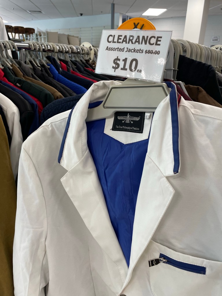 As a young man I sold menswear in a preppy Pasadena shop. We had some godawful sport coats and ties left over from the 70s. The same expensive quality we always sold, but colors and styles that hadn’t aged well. Wide and plaid are words that come to mind.