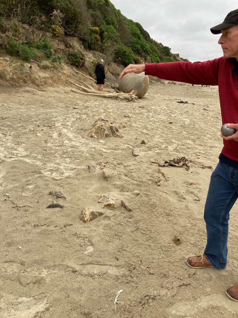 The Moeraki Boulders are big round concretions that have ended up on this beach due to erosion of the nearby bluffs.