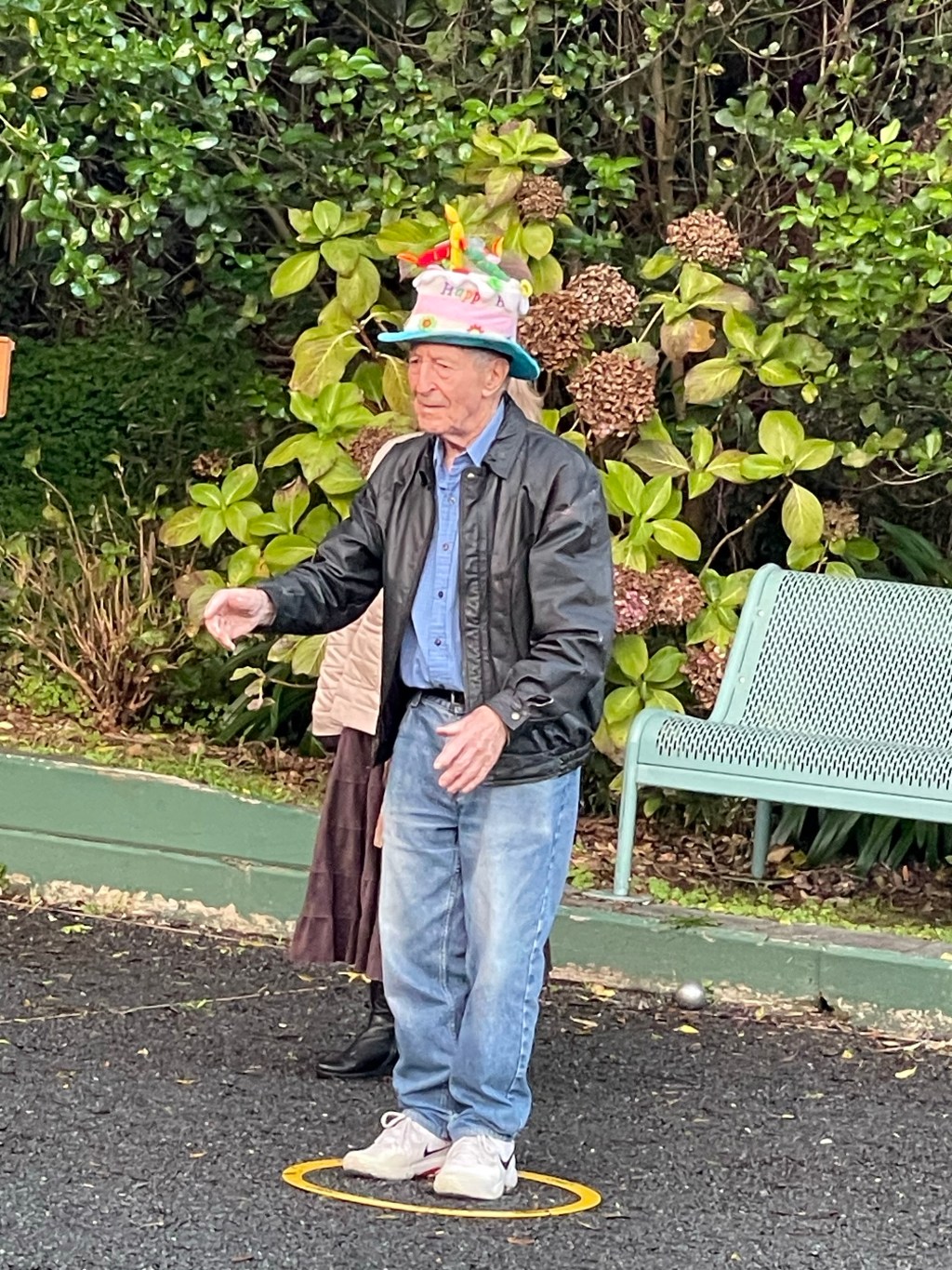 That’s Jim, a member of the Northcote Pétanque Club. He’s wearing the birthday hat bc we’re all helping him celebrate 90.