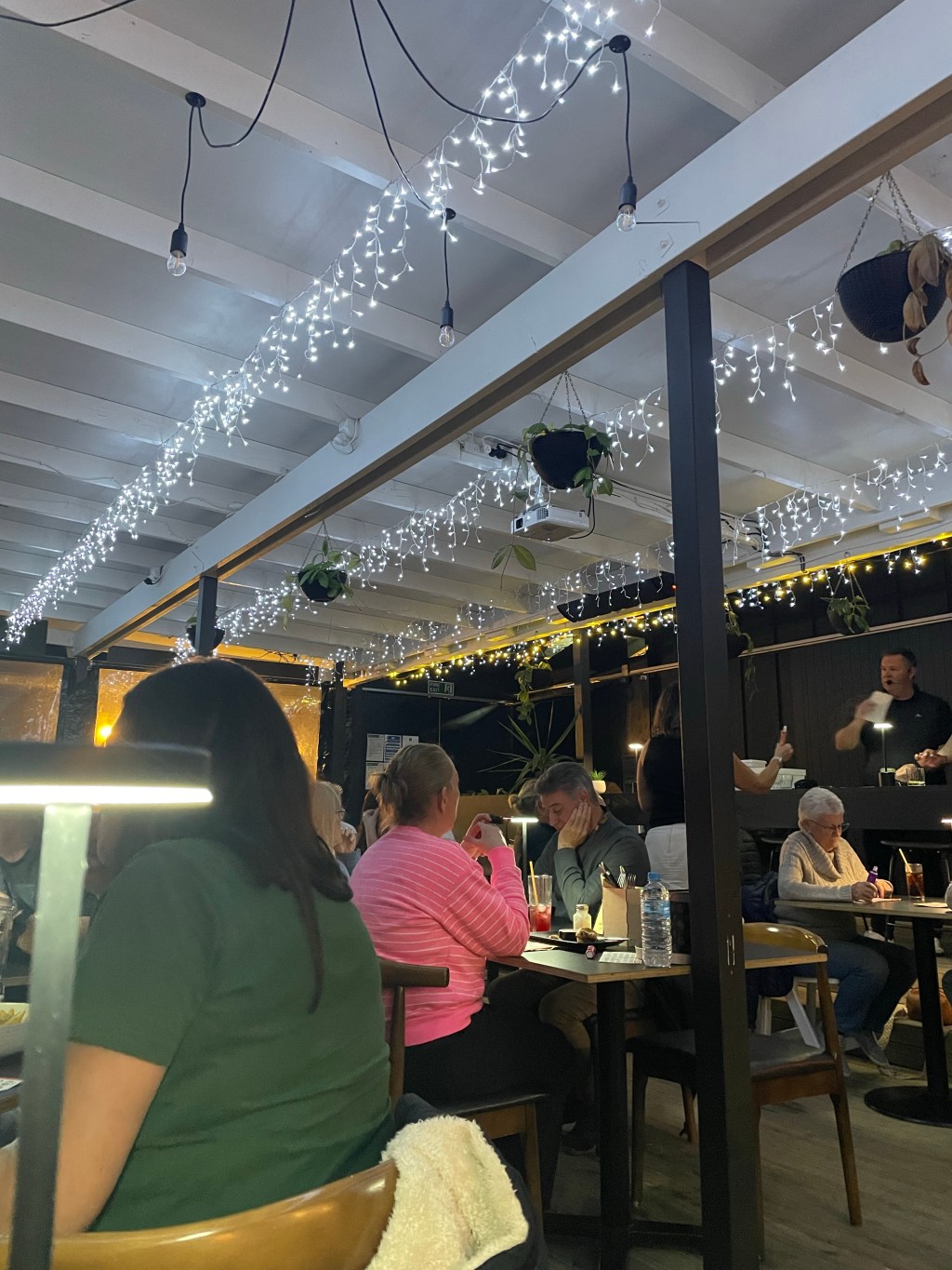 So, we ate our meal extra slowly and paid our 20 bucks for four games of bingo. It was really fun! You played two cards per game. They call the numbers slightly differently here: instead of saying I-22 they say ‘22, two ducks’. I guess the two looks like a duck. And every single number has its own little mnemonic… 47, stairway to heaven, number 4, shut the door. So that made it interesting.