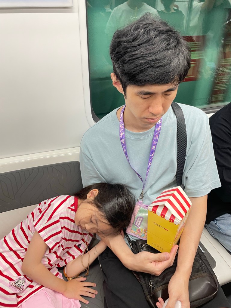 At the end of my day in Seoul, the returning train was standing room only. Everyone was tired, including this daddy-daughter duo who slept soundly until about one minute before they got off.