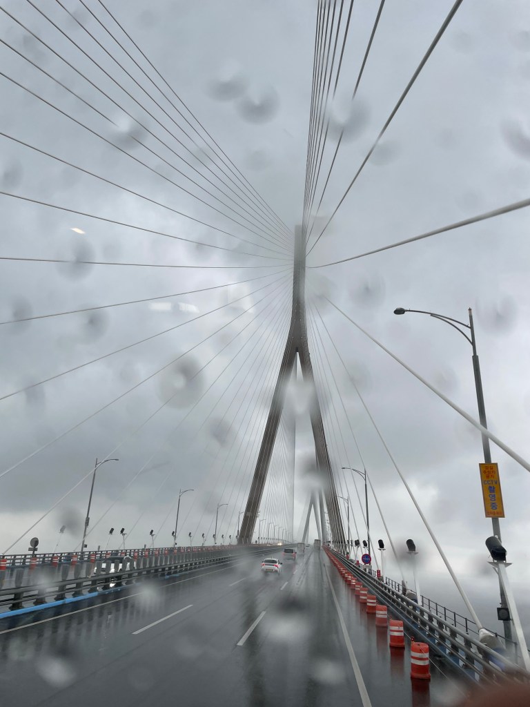 We crossed the Incheon Bridge in both directions… according to the spiel on the bus it’s an engineering marvel. It’s definitely very long. I was in the front seat of the upper level of the bus, and driving under these giant cables was pretty cool.