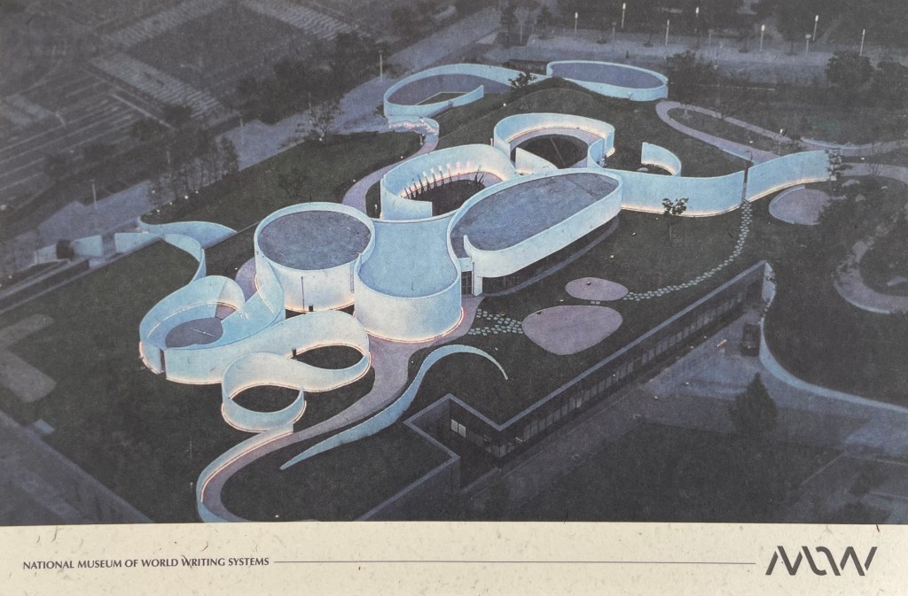 I saw the sign for this museum on one of my walks. National Museum of World Writing Systems? That’s pretty much catnip for someone who’s spent most of his career thinking about the names of things. So I went for a visit on my final morning in Korea. What a cool building! The picture above is of a postcard I bought showing the whole thing from a drone’s-eye view.