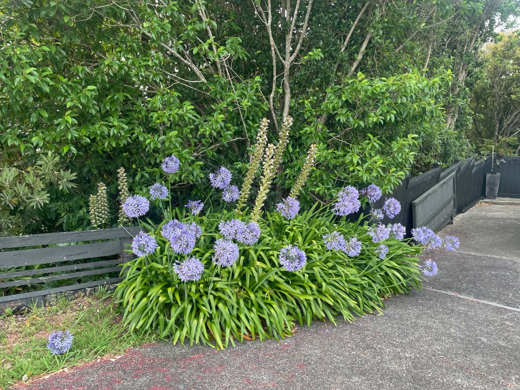 Two pretty flowering plants here. The purple ones are agapanthus. I’ve written about them before. They were widely planted around Auckland in years past. They look good and do a great job stabilizing steep banks. But they do spread a little more aggressively than most people might like.
