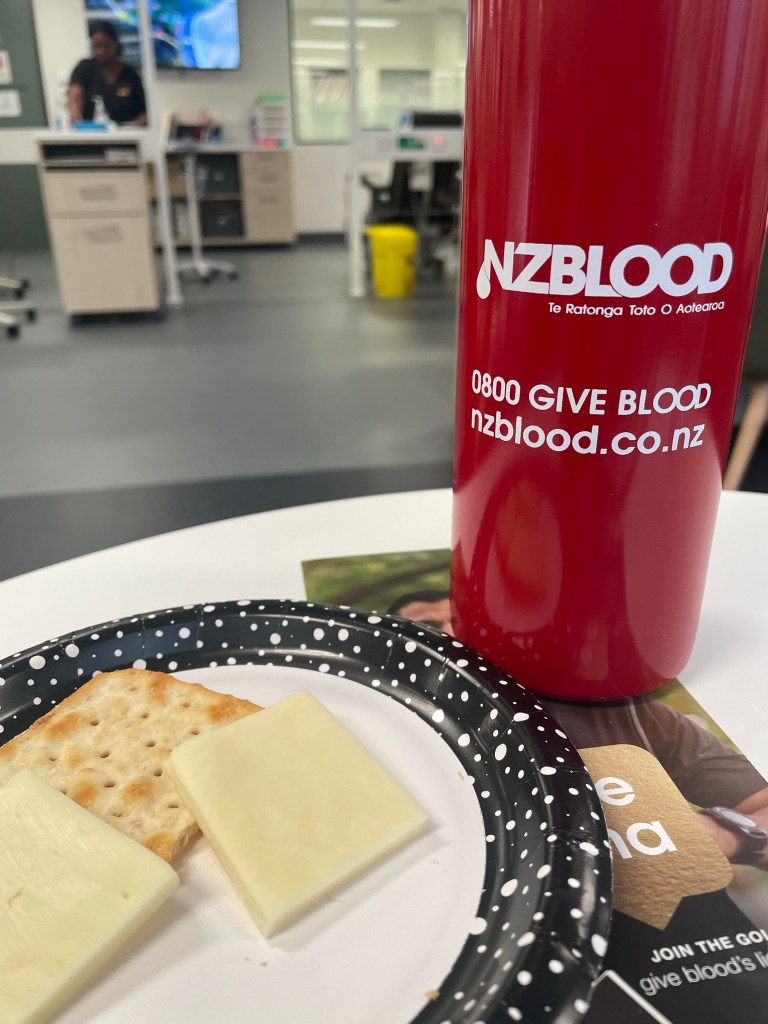 For my 10th NZ blood donation I got a nice water bottle plus the usual buffet of coffee, cookies and cheese ‘n’ crackers.